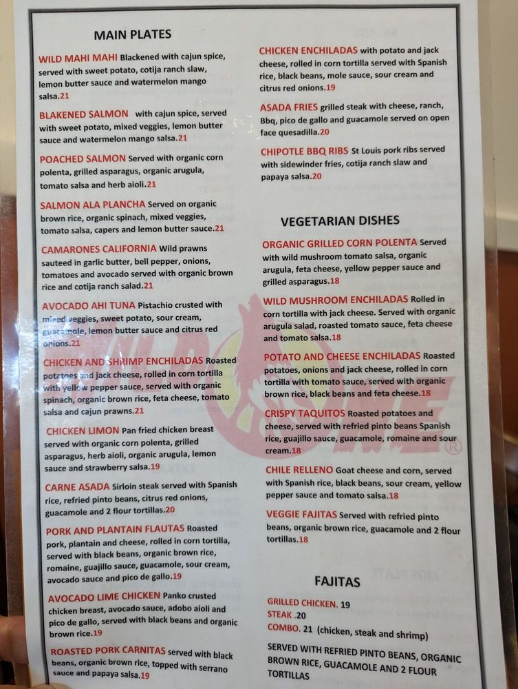 Highlights include mouthwatering Fajitas, available in Grilled Chicken, Steak, or a delicious combo, all served with fresh, colorful veggies. Kids are also catered for with tasty options like Crispy Chicken and Cheese Quesadillas.